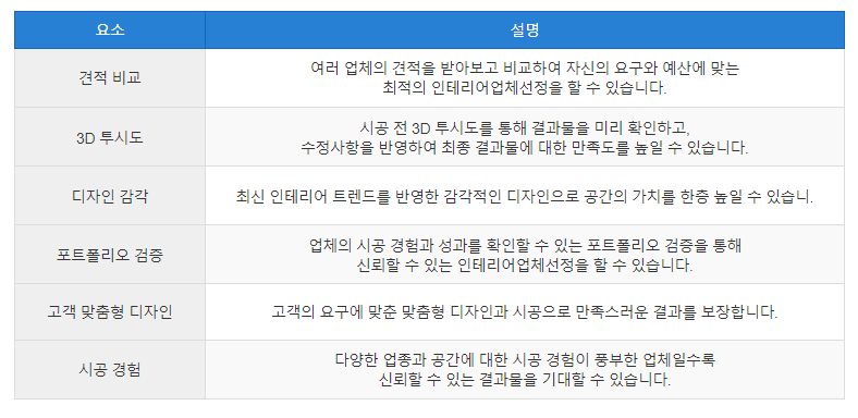 인테리어업체선정 시에는 반드시 포트폴리오를 검증해야 합니다. 업체의 포트폴리오를 통해 그들의 시공 경험과 성과를 확인할 수 있으며, 자신이 원하는 스타일과 맞는지 여부를 판단할 수 있습니다.