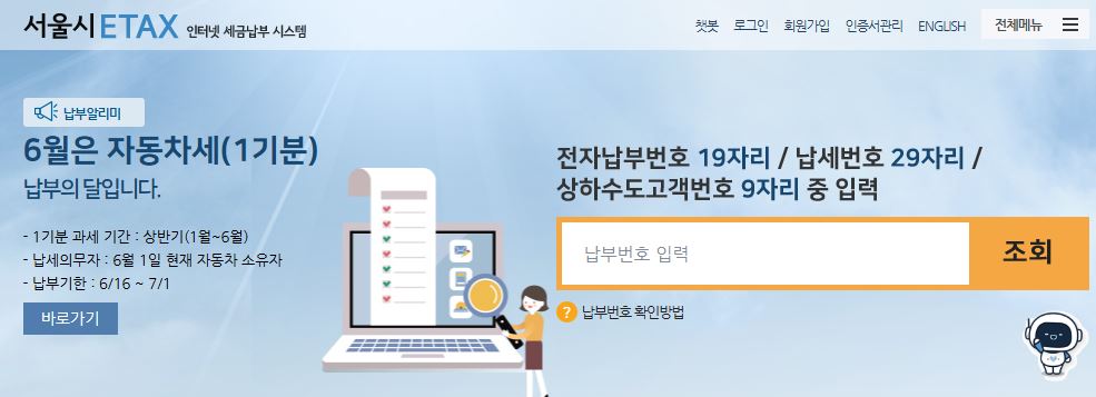 서울시에 거주하는 경우, 서울시 이택스 시스템 홈페이지를 이용하면 됩니다.