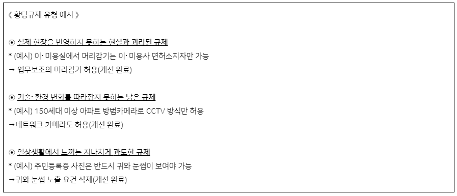 ㅇ 우리 일상생활 속에는 실제 현장과 규제가 괴리되어 있거나, 빠르게 변화하는 기술과 환경을 규제가 따라잡지 못하는 사례가 여전히 남아있다. 또한, 지나치게 과도한 규제로 인해 국민이 불편을 겪기도 한다. - 이러한 ‘황당 규제’가 무엇인지 이해를 도울 수 있도록 그간 정부가 개선한 황당 규제 사례를 아래와 같이 소개한다.