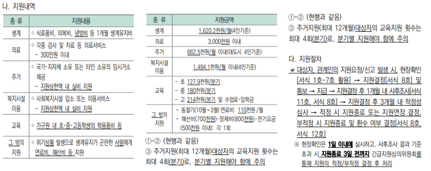 1. 생계 : 식품, 의복, 냉방비 등 1개월 생계유지비 -1,620,2천원 / 월(4인기준) / 최대 횟수 6회