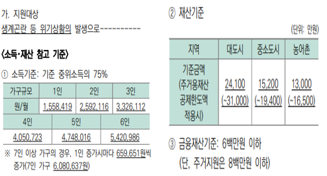 5. 화재, 재해로 거주하는 주택 건물에서 생활이 어려울 때 이 외에도 보건복지부령으로 정하는 기준에 따라 지방자치단체의 조례로 정한 사유가 발생했을 때도 위기사유, 상황으로 간주하여 긴급생계지원금을 신청할 수 있습니다. 단, 소득과 재산기준이 부합되어야 합니다. 2023년 긴급생계지원금 대상에 적용되는 소득, 재산기준을 살펴보도록 하겠습니다.